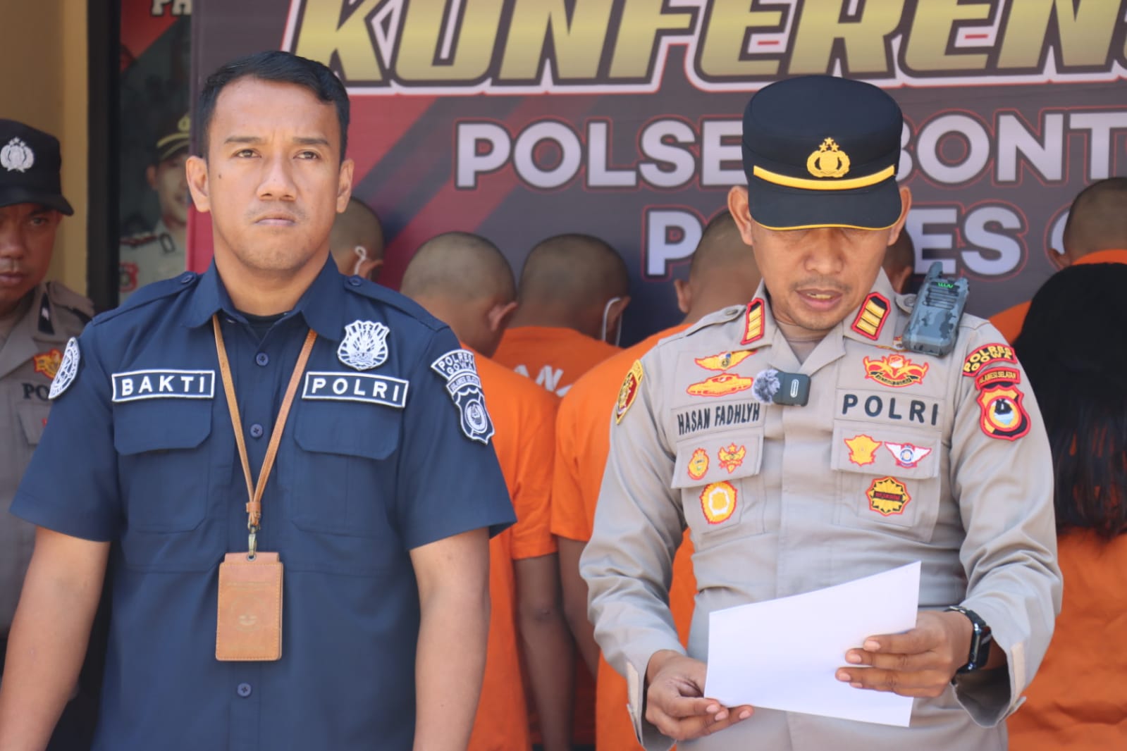 “Alhamdulillah, hari ini kita menggelar Konferensi Pers terkait kasus curat, copet dan jambret yang cukup meresahkan masyarakat di wilayah Kecamatan Bontonompo dan Bontonompo Selatan. Dimana kami berhasil mengamankan 11 orang pelaku dan 2 diantaranya masih dibawah umur serta 1 orang wanita,” ungkap Kapolsek Bontonompo.