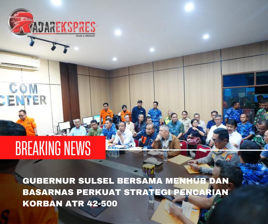 MAKASSAR, RadarEkspres – Gubernur Sulawesi Selatan, Andi Sudirman Sulaiman bersama Menteri Perhubungan RI, Dudy Purwagandhi, Kepala Basarnas Marsda TNI Mohammad Syafii serta unsur Forkopimda rapat evaluasi dan koordinasi terkait perkembangan pencarian korban pesawat ATR 42-500 di Kantor Pencarian dan Pertolongan (Basarnas) Kelas A Makassar, Minggu (17/1/2026).